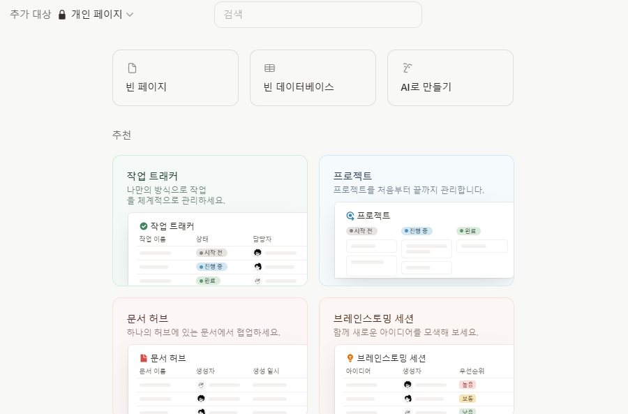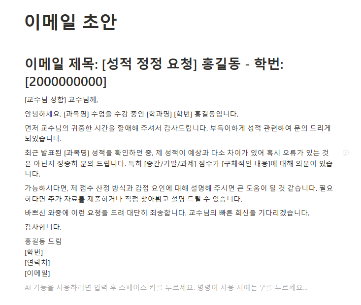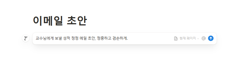빈 페이지에서 AI에게 "블로그용 1000자 글 초안" 또는 "친근한 톤의 고객 안내 메일"을 생성하게 할 수 있습니다. 완성된 초안 바탕으로 조금만 다듬어 줘도 훌륭한 원고가 완성됩니다.